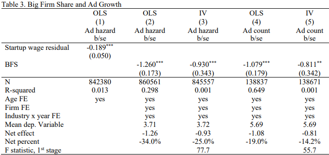 The data shows that when large companies in an area are doing a lot of hiring, it becomes harder for start-ups to grow their teams. The next scenario will predict as to what happens when the share of hiring by big firms in the local job market goes up: firstly, start-ups are less likely to advertise jobs at all. As a moderate increase in big firm hiring is linked to about a 1.3 percentage point drop in the chance a start-up even posts its first job ad. And secondly, even for start-ups that do start hiring, they tend to post one fewer ad per year on average. The bottom line is when big companies are hiring aggressively in a local area, start-ups are more likely to stay quiet. As shown before, they post fewer job ads and consequently probably hire fewer people. The competition for talent is just too steep. But is that the biggest threat?